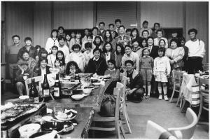 バーベキュー大会終了後、宿泊場所のロビーにて懇親会が持たれました。あんべさんと記念撮影をしたり、持ち寄ったレコード・CDなどにサインしてもらったりの後、あんべさんから歌のプレゼントもありました。