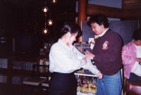 | 洋服にサインしてもらう人も。 | あんべさんから、歌のプレゼント中! |
